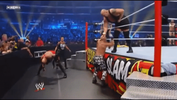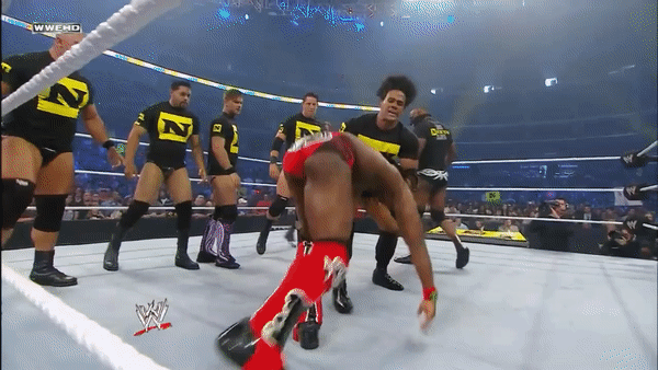 JT: So off the Famouser, Dolph stalks Kofi in the corner, charging at him only for Kofi to dodge out of the way and hit a pendulum kick through the ropes. Kingston then went up and hit a Flying Chop before once again lining up Trouble in Paradise. He spins, he kicks, but nobody home and Dolph slips in form behind and gets the Sleeper hold in!! I was about to go into a spheal about how Dolph managed to get the Sleeper over during this run, but it turns out we’ve got company!! The Nexus 7 are out at ringside, and they’re getting the Intercontinental Title match thrown out!! They knock down both guys, clothesline Ziggler out of the ring and circle Kofi. Kofi tries to fight but like many others before him, he stands no chance with the numbers against him. He gets the group beatdown and then a Full Nelson Facebuster thing from Darren Young and Wasteland from Wade Barrett to punctuate it. Well, I suppose that’s why Dolph & Kofi tried to front load their match, huh?