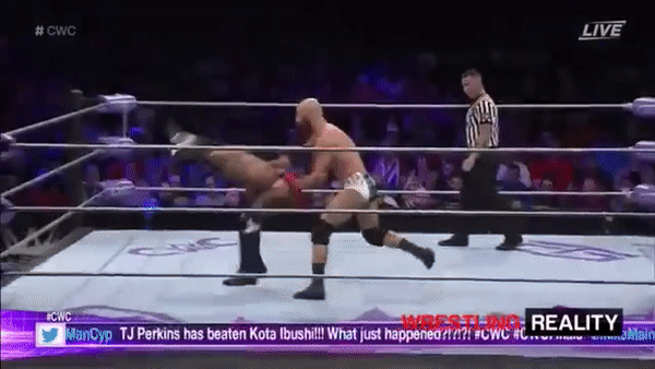 JT: Ok now that we’re officially off track, I’m gonna get us back to the match. So Ibushi runs into a high kick from TJ, but then he catches TJ with a Powerslam, then he rolls and goes for a Springboard Moonsault out of the corner, but TJ gets the knees up!! He grabs the Kneebar!! Ibushi makes the ropes but that’s already a key bit of damage! They both get up, Ibushi charges into a Spinning High Kick, TJ lifts him for the Detonation Kick, but Ibushi goes behind and gets a Straight Jacket German Suplex!! 1–2–Kickout!! Ibushi lights up TJ with huge kicks to the chest, knocking TJ to the apron and then hammering him as he’s tied up in the ropes. This allows him to try and go for the Swandive German Suplex, but TJ gets elbows to fight it off to some boos. Let’s be real, we all wanted to see that move again. But now with Ibushi hung up on the ropes, TJ scores with the Springboard Wrecking Ball Dropkick and then goes to the top rope, only for Ibushi to hit a Pele Kick and knock him off the top!! Ibushi goes for the Golden Star Powerbomb, but Perkins reverses into a DDT!! He picks him up and hits the Inverted Lungblower!! He covers, 1—2—Kickout!! What a huge counter, he absolutely spiked Ibushi!!