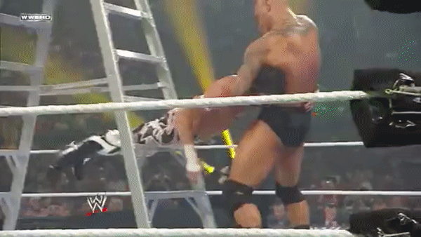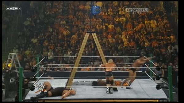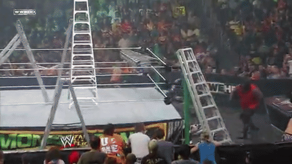 JT: If I want to understand the Vince, I gotta think like the Vince! Although, maybe I shouldn’t try that. So back to the match, as Miz catapults Morrison at a Ladder, but JoMo lands in it, climbs up it into the ring, then lets the ladder fall to get him over to the main ladder in the ring!! Unfortunately, he can’t get to the case before getting caught by Edge, with he and Miz bringing the ladder down on Johnny until Edge hits Miz in the face for good measure. Now Ted rejoins the action, taking out Edge and setting up a ladder upside down. Typical, weird ladder construction now as a ladder is now in a rung of the upside ladder. Ted tries to win but Henry comes in, so he tries to get the jump on him by leaping off the ladder, only to be caught into a World’s Strong Slam by Henry. Henry then drops The Miz onto Jericho, who himself is on top of the ladder. Ouch. And it’s at this point I noticed, Jericho and Randy, they’ve really not done much this match have they?