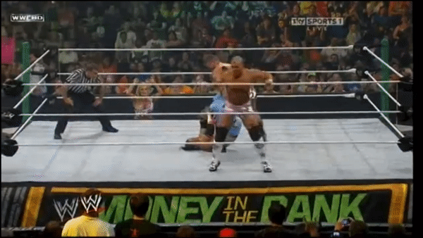 JT: So our SD MITB begins with everyone attacking the two big guys, and then fight each other as Cody goes for a ladder. Unfortunately for him though, Show & Kane clear out the masses, leaving him alone on the ladder with the two big men. He gets a hard chop across the back from Big Show, then an uppercut under the chin from Kane, sending him out of the ring and leaving the two of them alone. Kane might be fighting with a vengeance for his brother, but that still doesn’t mean he’s strong enough to withstand a shoulder tackle that knocks him down and out of the ring. That means it’s Big Show all alone, with just the ladder in his way. He goes to step, and immediately the rungs break under his weight. Not gonna lie, as a kid this story intrigued me, I mean, how would he climb? Could he still manage to win with this issue? What if Big Show fell off a ladder, would the ring explode??