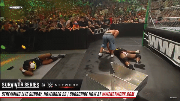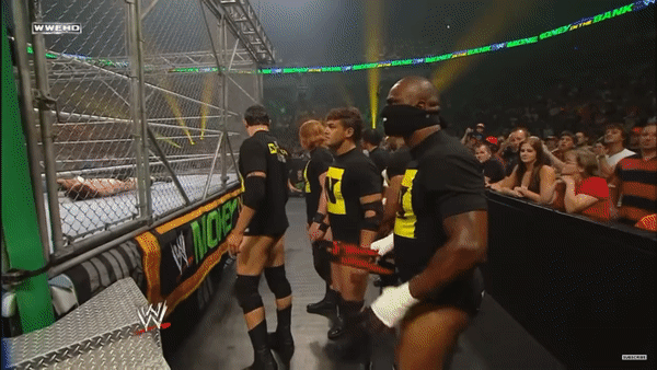 JT: Meanwhile back in the ring, Cena is back up, going for the AA, but Sheamus shoves him into the ref into the Cage. Now he’s down as well! It only briefly stops Cena, who quickly locks him in the STF and gets the tap out, but that doesn’t count now! So rather than wait for him or the red to get up, he decides to try and climb out, only to be met by Justin Gabriel at the top of the Cage. They fight and Gabriel is sent all the way down to the mat! But he’s not the only Nexus member on the move, they’re swarming him on the way down! On the other side though, Sheamus is trying to sneak out the back door. He has only Slater in his way and he wins the battle of the gingers and he knocks Heath down and falls to the floor before Cena can make it down!! Sheamus wins!! The Nexus has cost Cena again!!