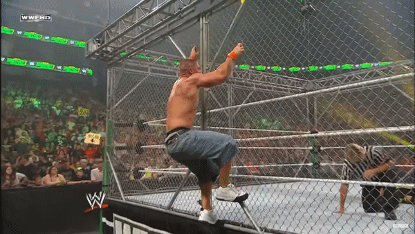JT: Luckily Cena starts to fight his way up to his feet and starts to climb up the corner with Sheamus on his back. Realizing he can’t weigh down Cena, Sheamus releases the sleeper and cuts Cena’s leg out from under him. Then he tries to climb up, but Cena pulls Sheamus down onto the ropes and suddenly he’s firing up. 3 of the 5 Moves of Doom connect, but the AA is blocked as Sheamus grabs the cage and starts to climb up, so Cena sends him into the cage, knocking him down to the mat. With Sheamus down, Big Match John goes up to the top rope, but instead of trying to climb out, he leaves off for a Super 5 Knuckle Shuffle, only for Sheamus to move out of the way at the last second. And I promise this is the last time we’ll bring this up, but King straight buries Cena for going for the move instead of escaping. That’s our line! Also, since when did King take over this commentary role? Isn’t he usually the one who defends Cena in these kinds of circumstances? How many bees are on his bonnet tonight?